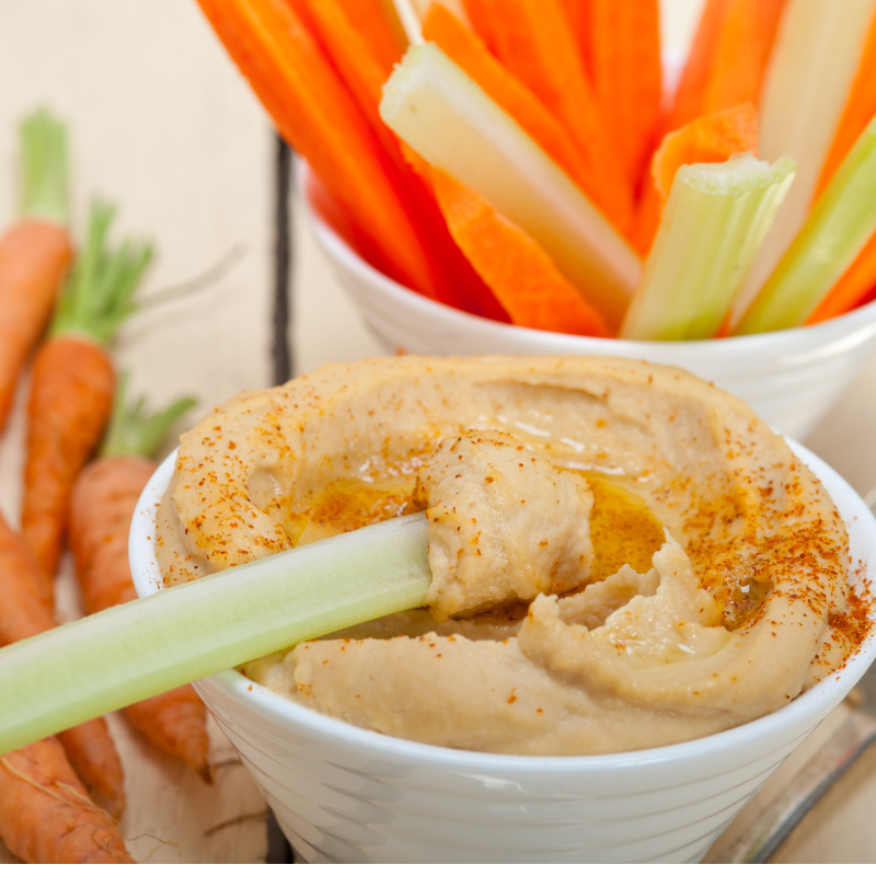 - Krémová cizrnová pasta podle tradičního receptu: Hummus vytvořený z kvalitní cizrny, tahini, extra panenského olivového oleje, voňavého česneku a špetky soli. Bohatá, jemná, sytá chuť – ideální kontrast k osvěžující zelenině.